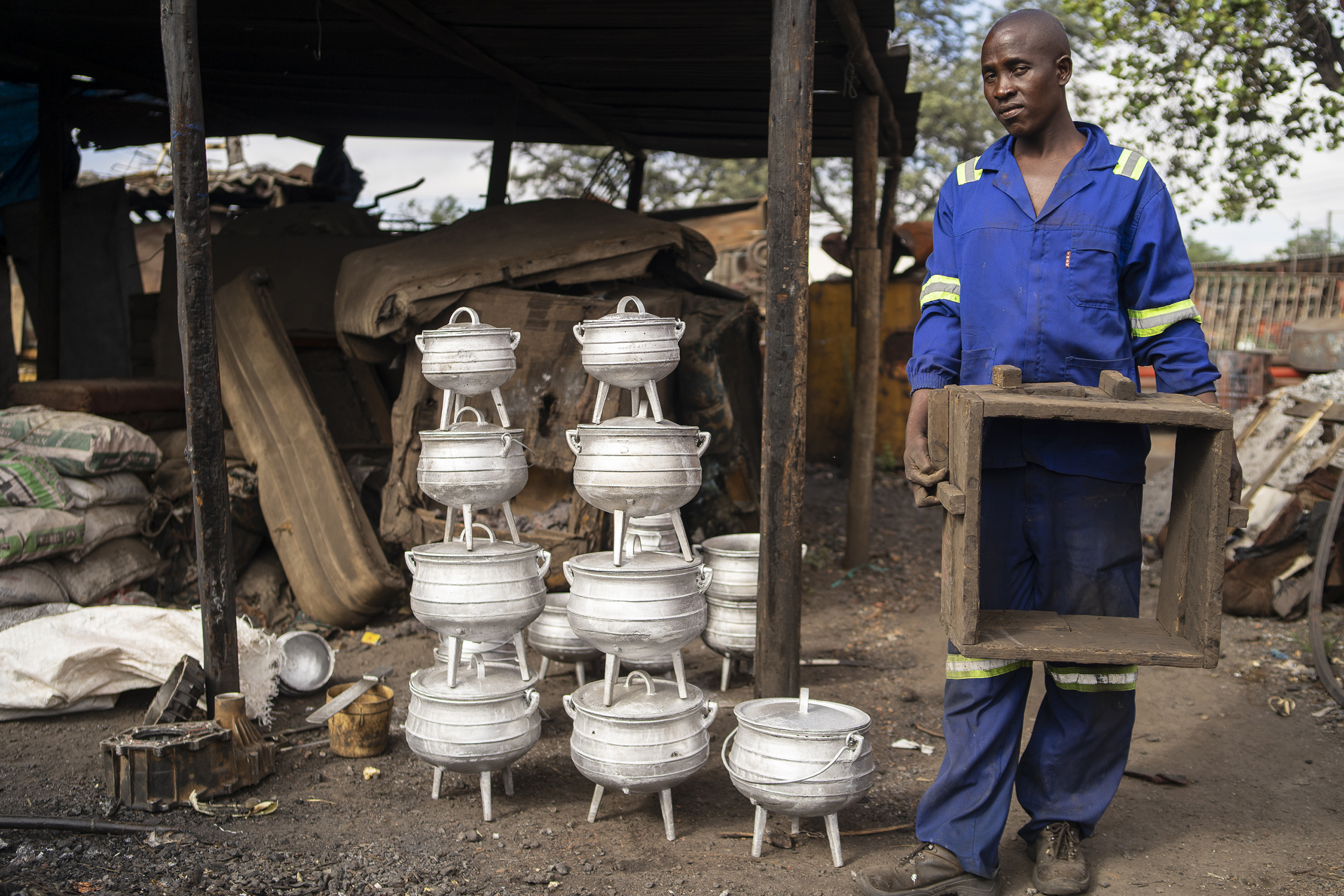 Lowani Ncube, who makes aluminium pots at one of the thriving informal backyard workshops in Bulawayo’s Renkini area, says he buys and melts scrap from car breakers.