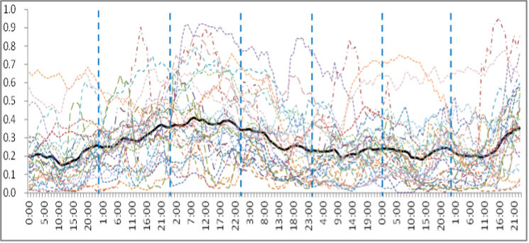As shown in the figure below, the wind power output of individual provinces (coloured lines) fluctuates greatly during the course of a day. But the line levels out when outputs are coupled across a broader geographical range – in this case the northern, central and eastern zones of the country – enabling new energy sources to be better consumed.