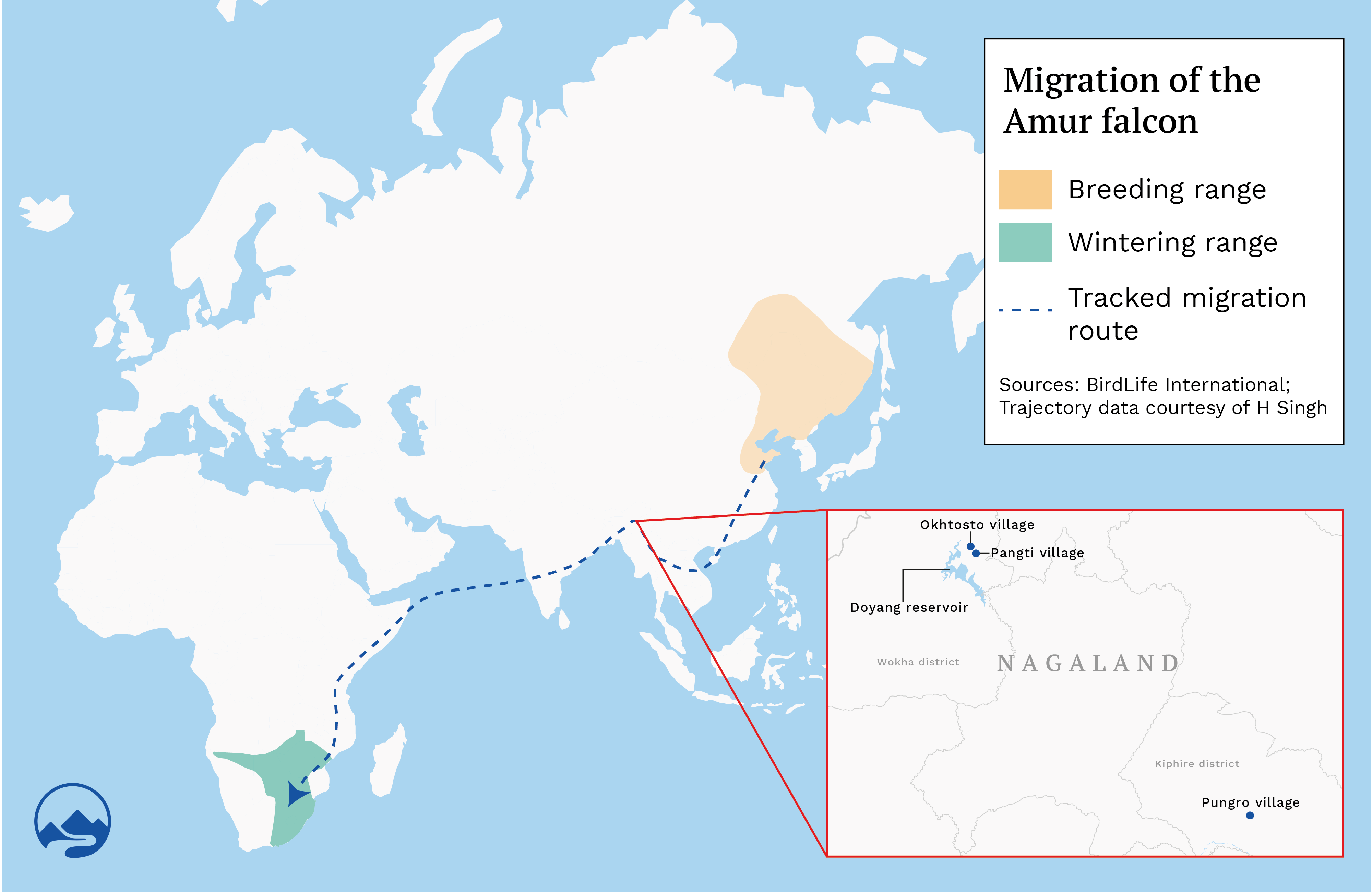 “Since the two Amur falcons were radio-tagged and christened in Tamenglong [in Manipur, northeast India] in 2019, people here have been fascinated by their 20,000 km journey across continents,” says H Singh, forest officer of Tamenglong district. “Many are following updates of their movements on our Facebook page and anxiously praying that they reach India and return to our district safe and sound later this year!”
