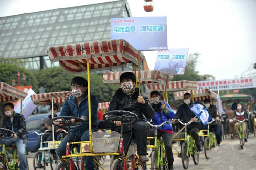 In February people in Chongqing took to the streets with masks and placards to protest again the smog (Image by Chinanews.com)