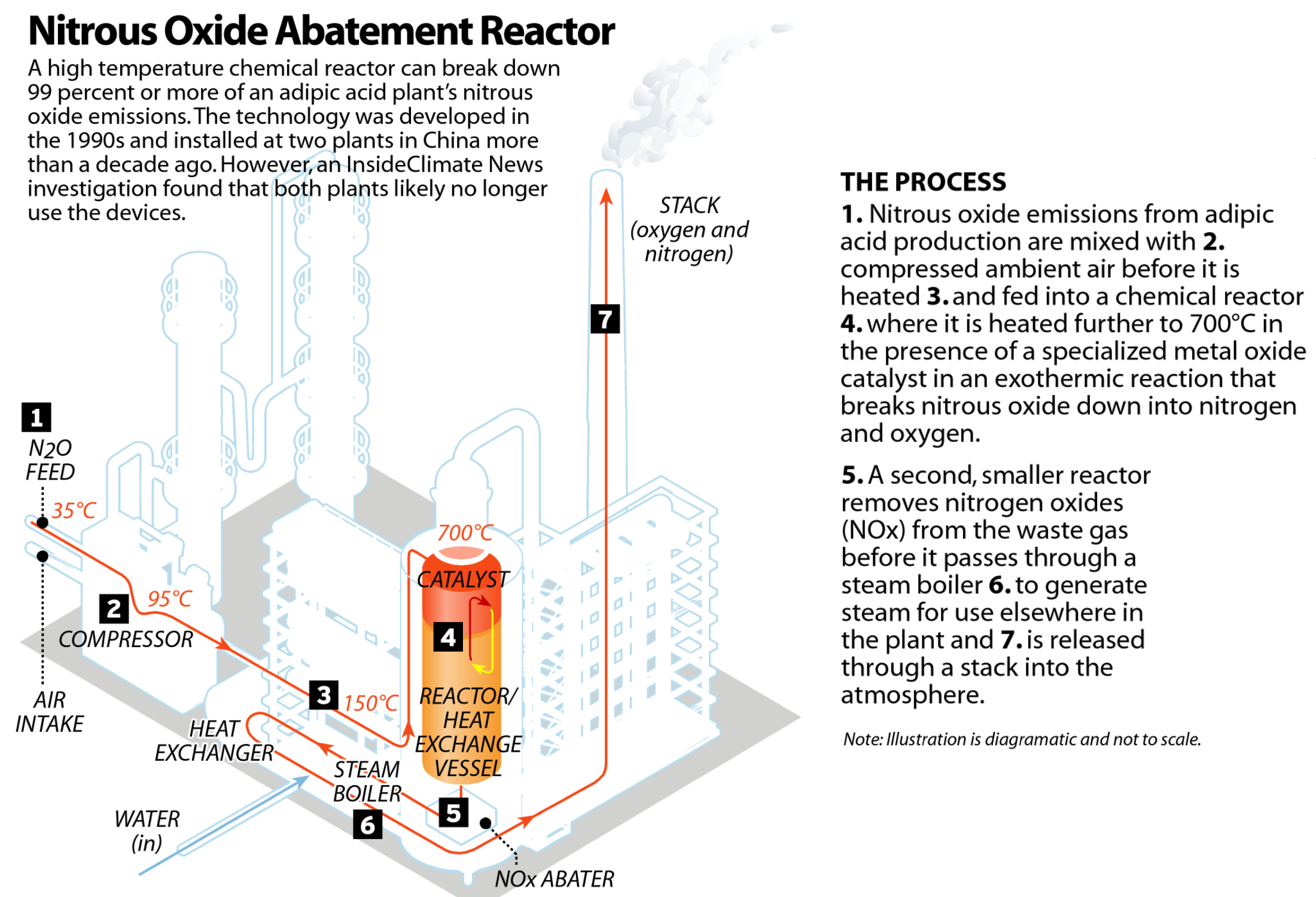 A follow-up report by InsideClimate News published shortly after this article was published found that the current commercial recycling capacity of N2O in China is slightly higher, at 29,000 tonnes per year, but this is still just a small fraction of the total N2O being created in China’s adipic acid plants.