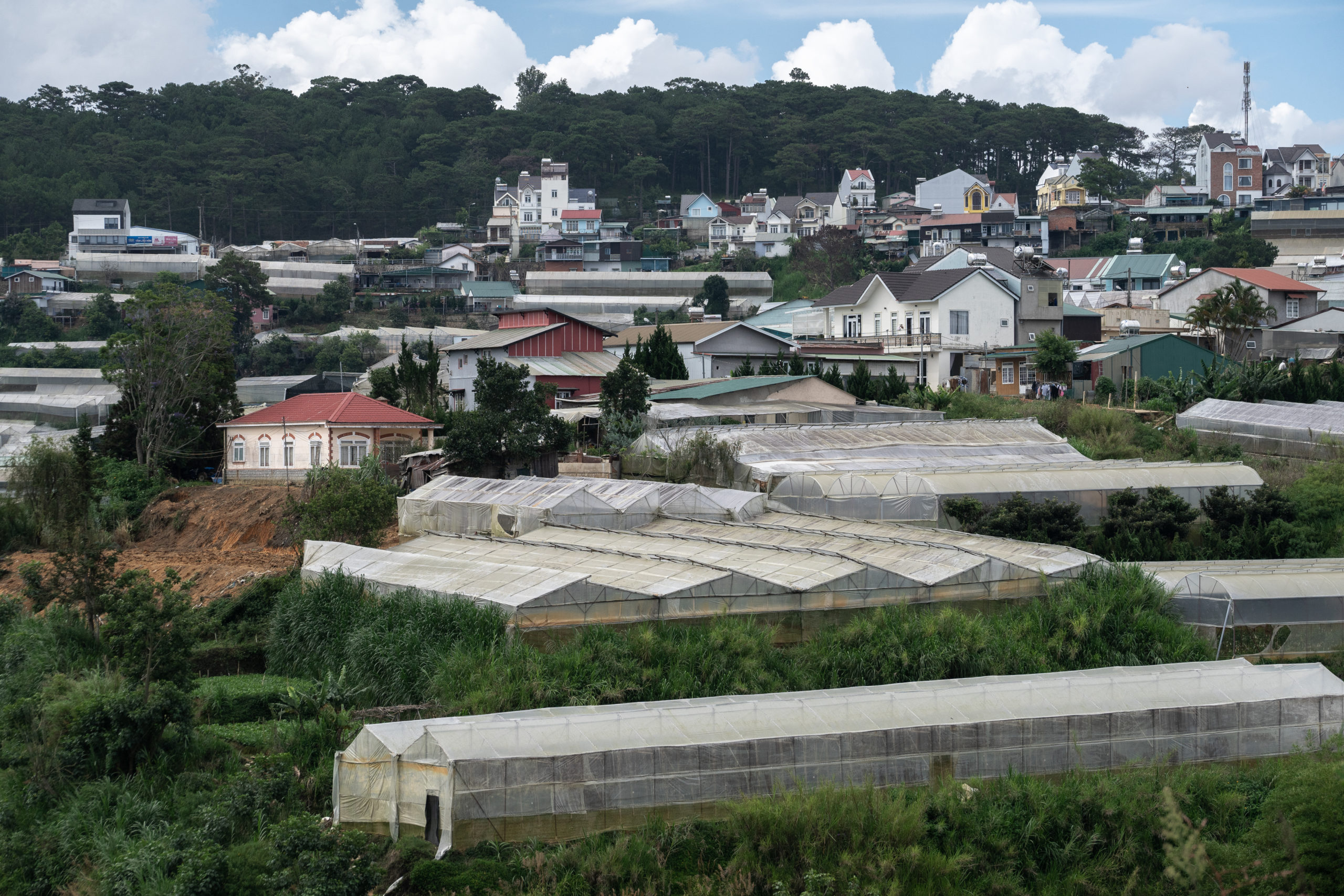 Dalat is the capital of Lam Dong province. The municipality is known for its temperate climate, rolling hills, pine trees and agriculture. Over the past two decades, plastic greenhouses have enveloped much of the landscape within the city and surrounding areas. These greenhouses have increased agricultural production and raised farmers’ income. However, they are also contributing to rising temperatures, floods, pollution of waterways and the build-up of agri-plastic waste, with no formal system for recycling.