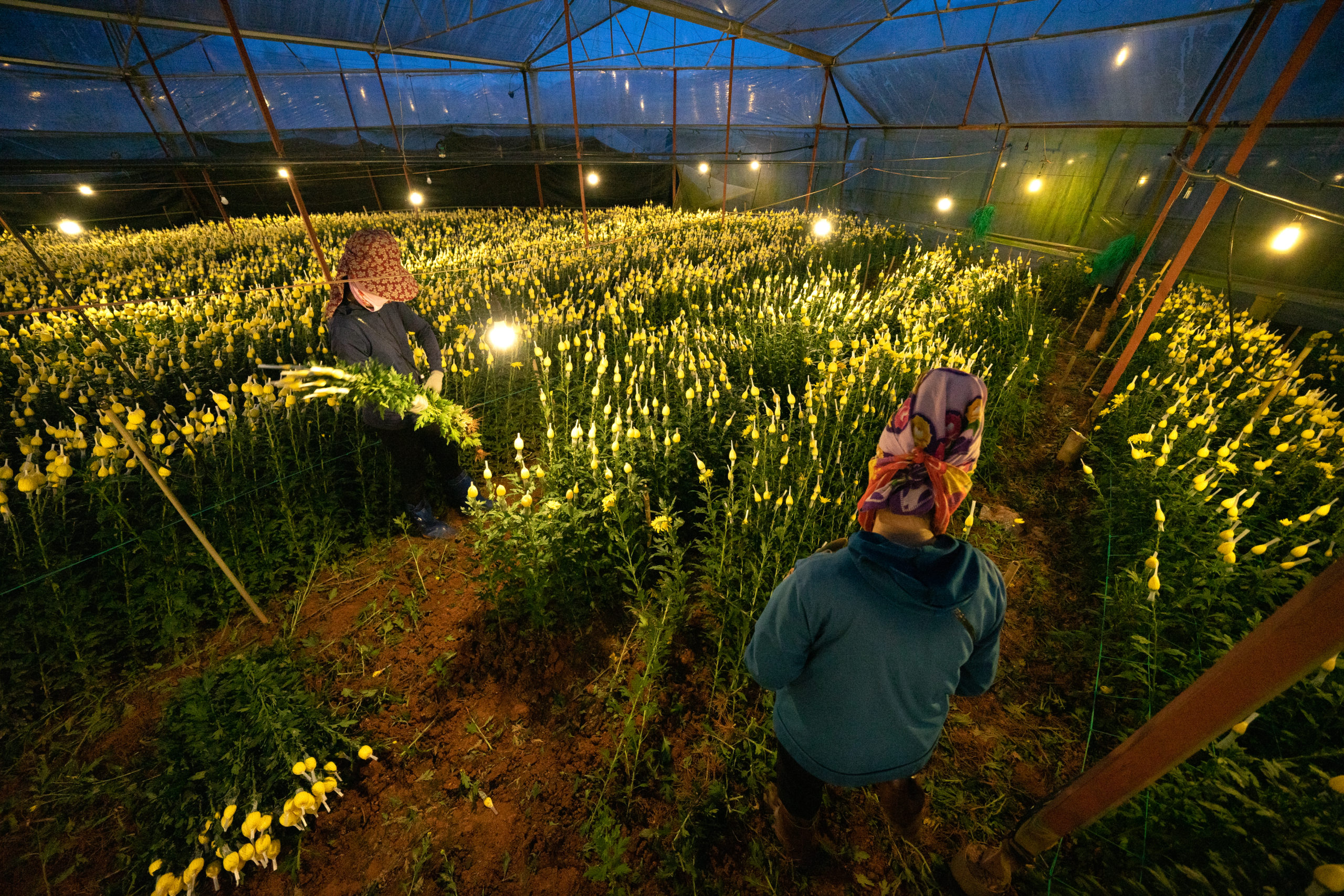 Hiền, a farmer in Dalat, says he relies on plastic sheeting to ensure a stable growing environment for his crop of flowers. He rents the land where he has a small greenhouse for six-month periods, so it is vital his crops come to harvest reliably within this time. From Hiền’s roadside flower farm, greenhouses can be seen in every direction.