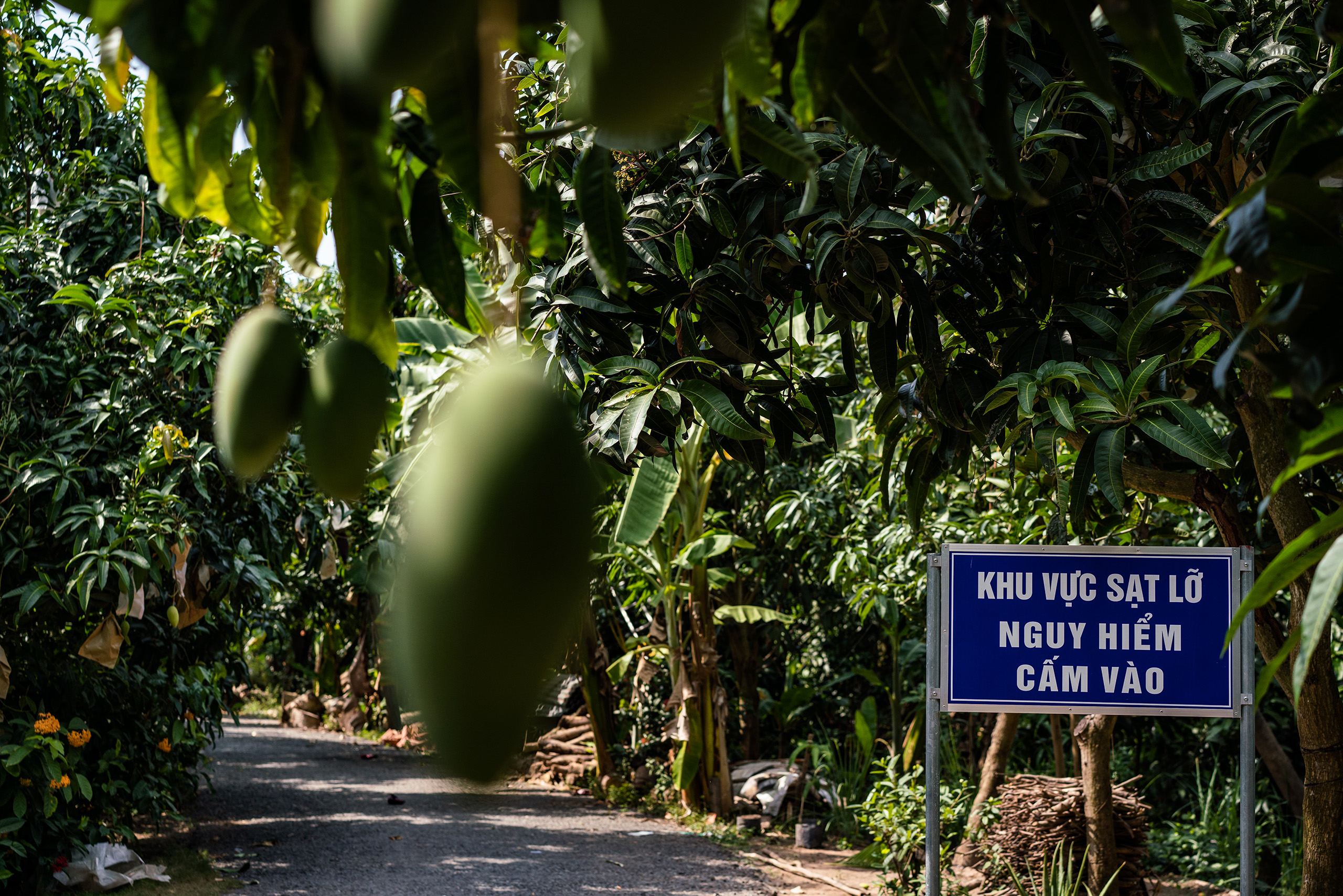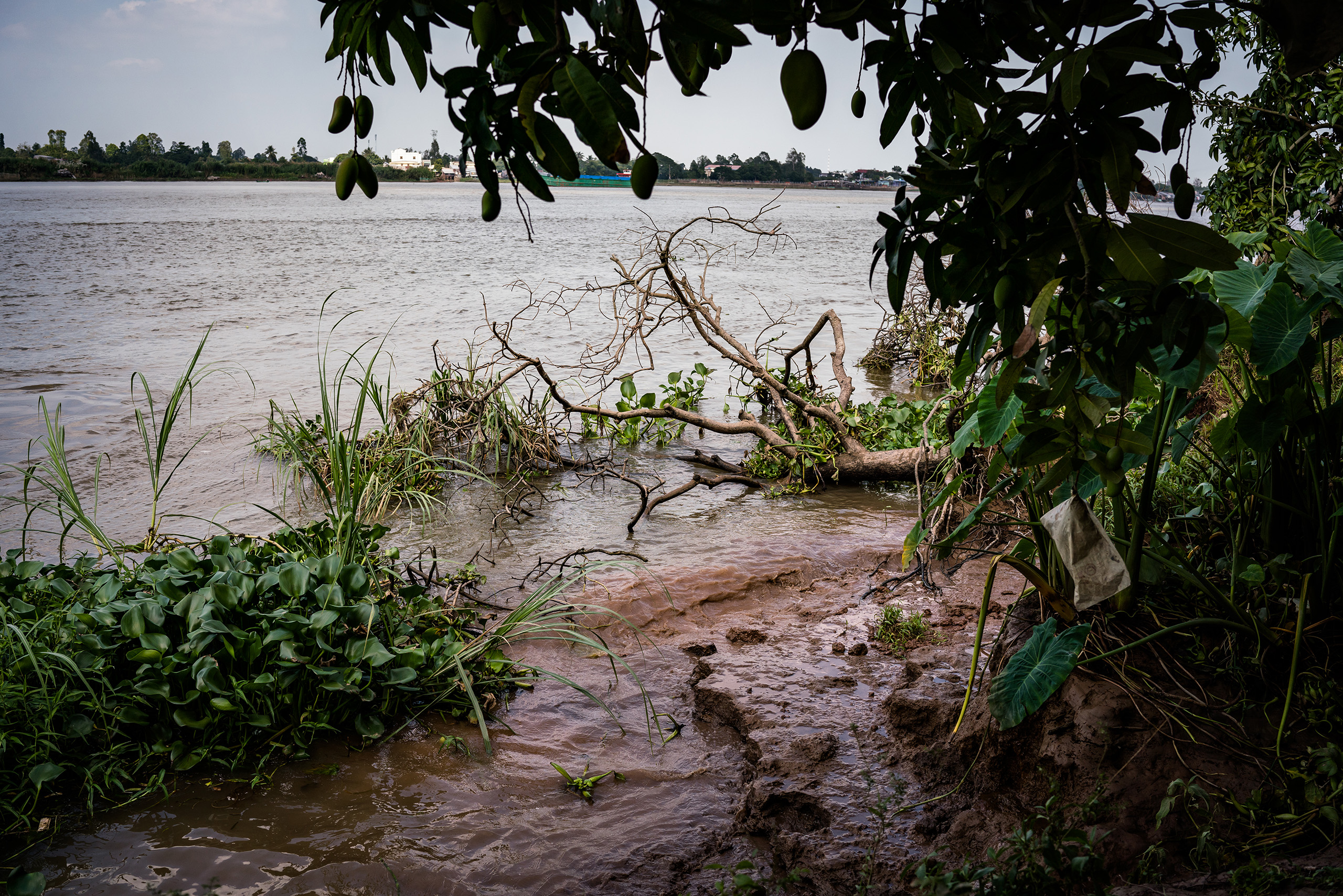 A nearby ferry crossing protected by a stout concrete embankment leads to Tan Thuan Dong, a large island carpeted by mango orchards in the middle of the Tien river. A sign on a narrow road leading to the northwest edge of the island warns people that they are entering an erosion zone.