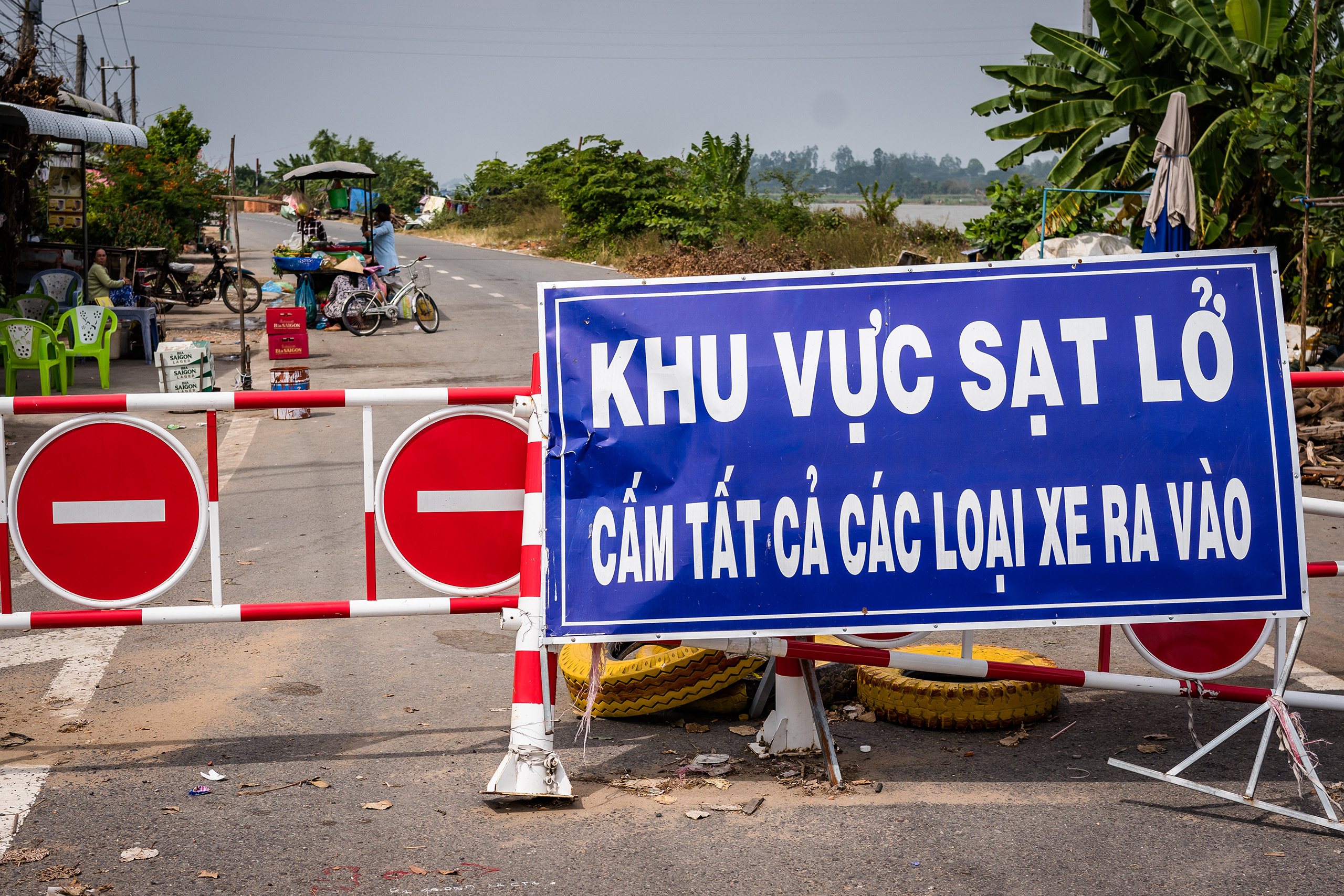 In neighbouring An Giang province, National Highway 91 connects Can Tho, the Mekong delta’s largest city, with the Cambodian border 100 kilometres away. Heading towards Cambodia along the bank of the Hau river, the Mekong’s other main branch in the delta, the road eventually runs into a barrier and a large sign warning vehicles not to enter. While traffic is diverted onto a new road, pedestrians can enter the barricaded area.