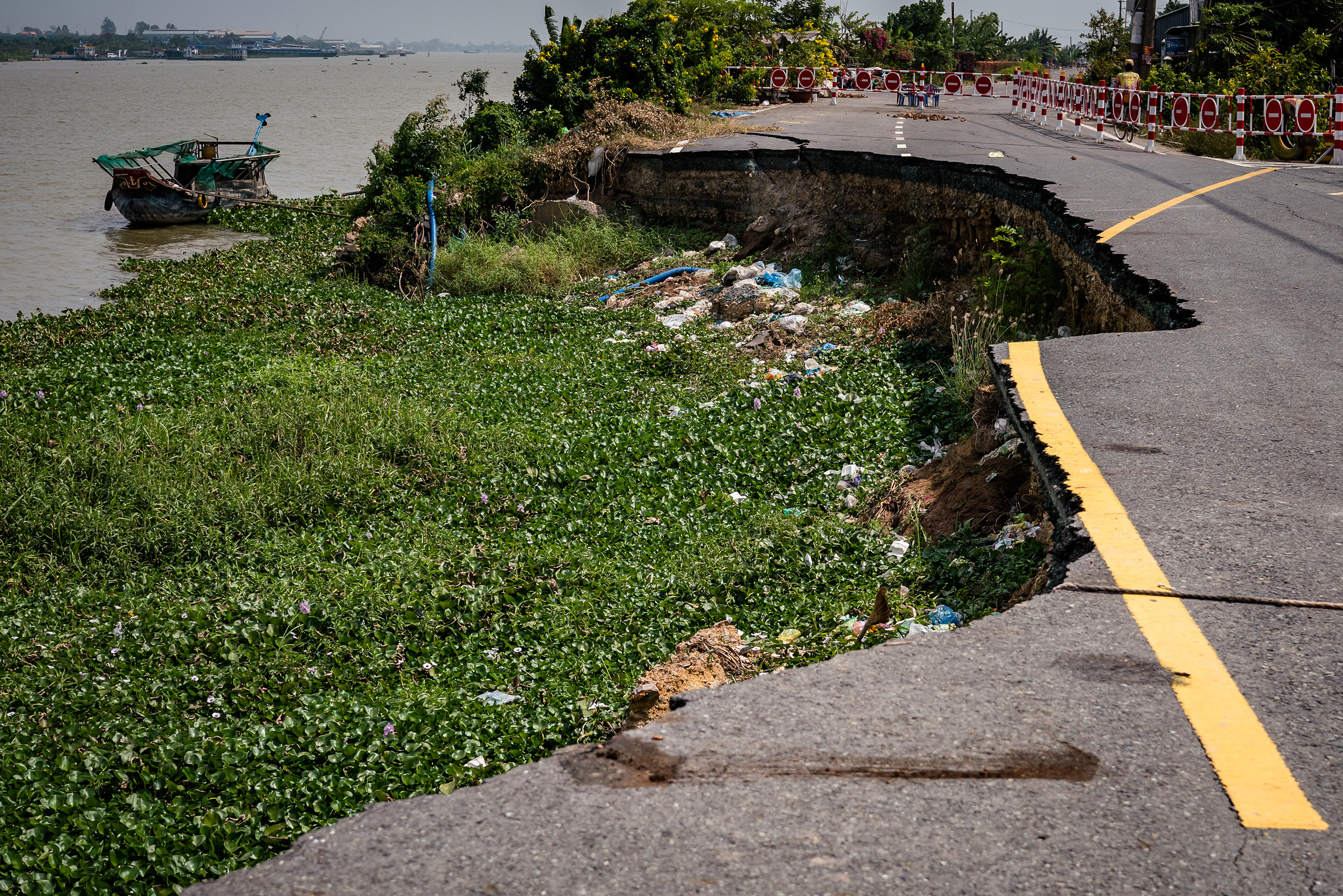 Further down the road, Thi (not her real name) lives on the edge of one of the sinkholes. She sells rice from her home and previously benefitted from buses stopping outside. Only motorbikes and bicycles can pass now, creating a peaceful setting for a front-row seat to what might be in store for the rest of the delta.