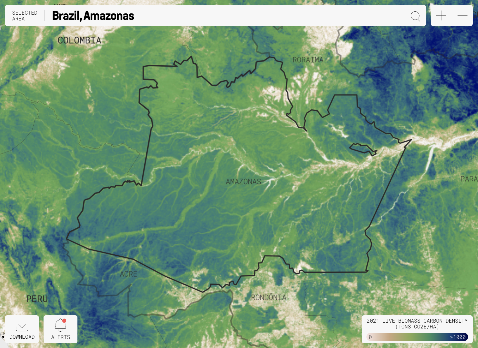 Captura de pantalla del portal CTrees que muestra la “densidad de carbono” de la tierra en el estado brasileño de Amazonas, que alberga gran parte de la selva amazónica. Cuanto más oscuro es el color, más CO2 se almacena por hectárea de tierra (Imagen: CTrees)