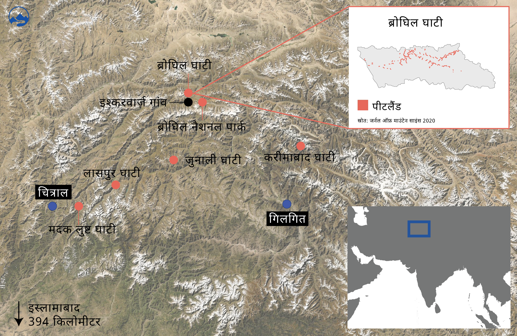 ब्रोघिल पर्वत दर्रा चित्राल में सबसे उत्तरी घाटी है और हिंदू कुश पर्वत श्रृंखला को पार करती है। सर्वे के 10 साल बाद शोधकर्ताओं ने अनुमान लगाया कि ब्रोघिल घाटी में अब करीब 1,190 हेक्टेयर में पीटलैंड है।