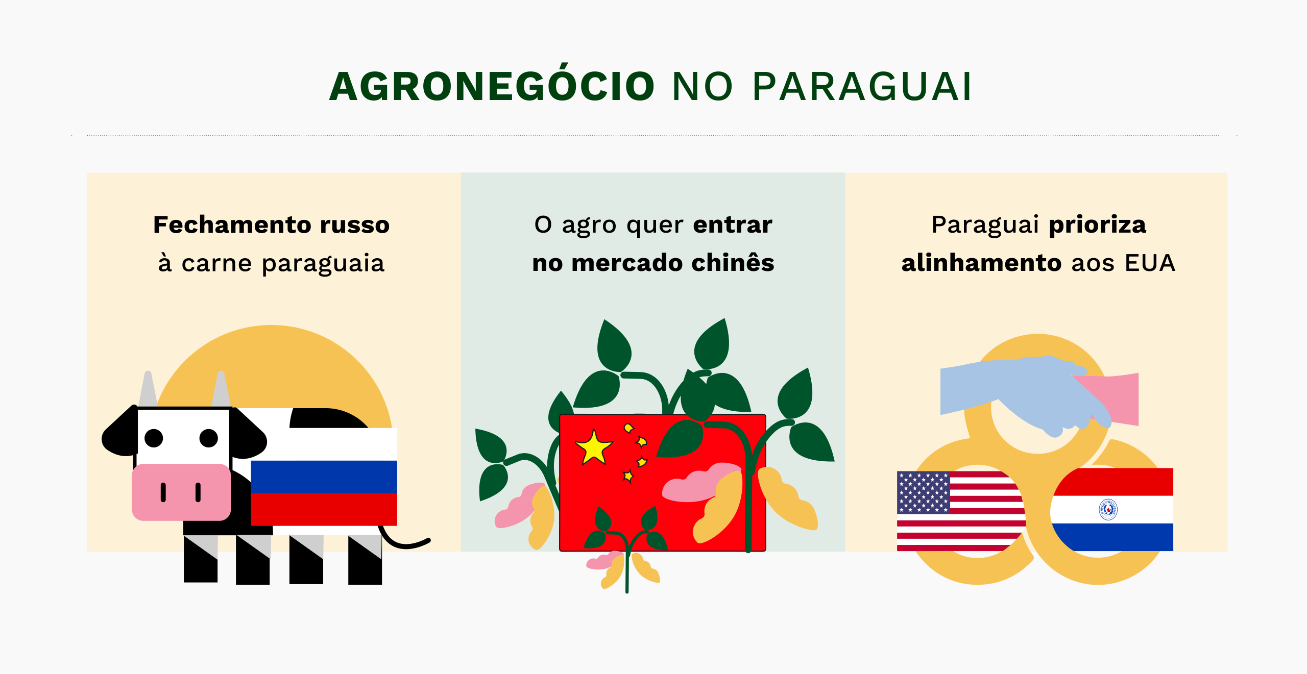 Peña também argumentou que a alta qualidade das commodities paraguaias é o suficiente para suas vendas. “A China não vai comprar carne ou soja paraguaias por interesse diplomático”, disse ele durante a campanha. “Ela vai comprar porque o Paraguai tem carne e soja de boa qualidade a preços competitivos”.