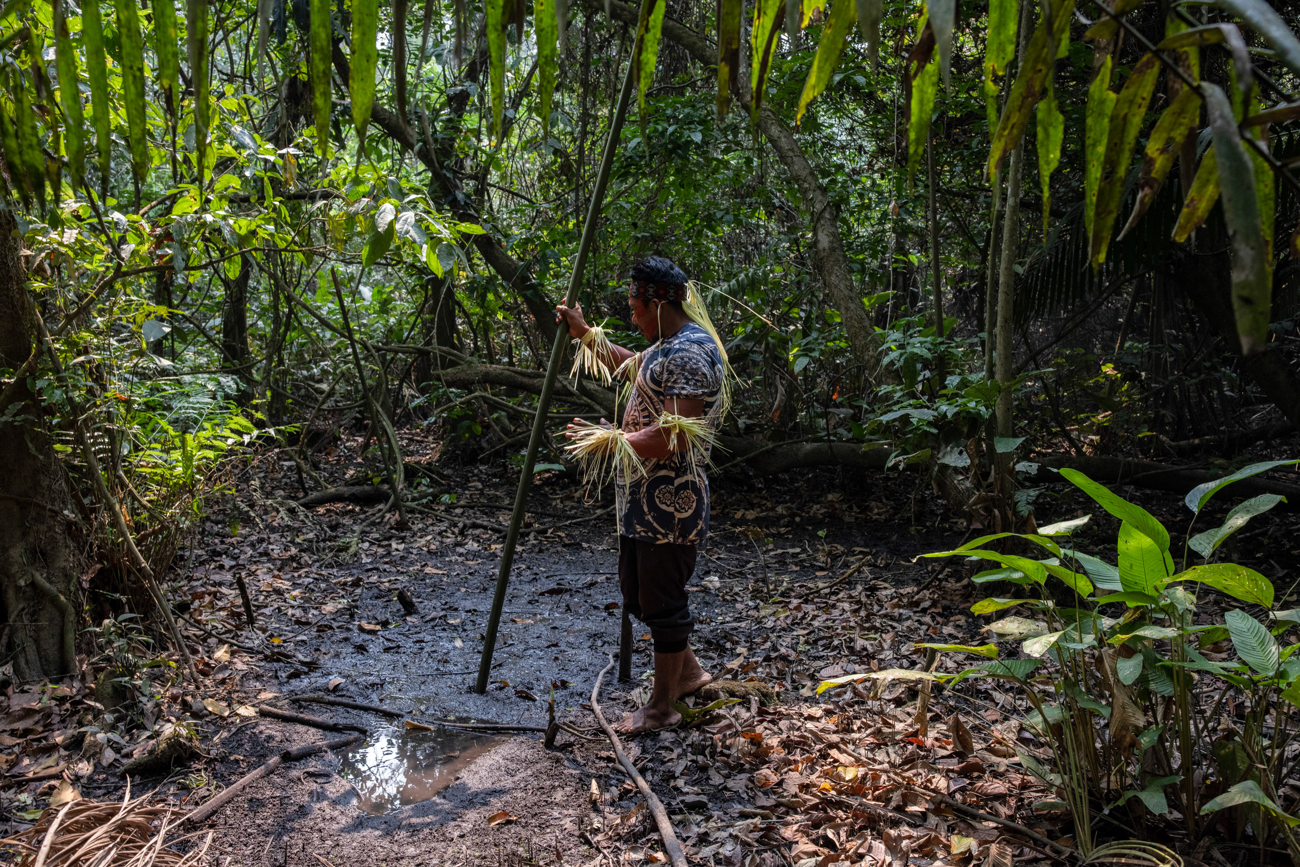 De volta à canoa metálica, nosso grupo navega por dez minutos até a outra margem do Rio Gregório e caminha mais dez pela mata até um buritizal lamacento. Tani corta uma vara de sete metros e a enfia na lama até ela desaparecer.
