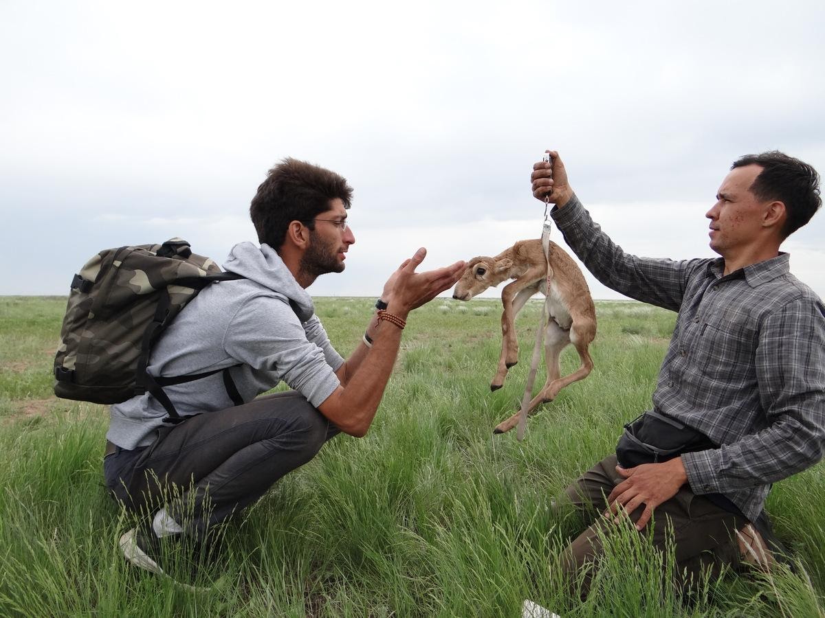 Учёные весят сайгака (фото: Муниб Ханьяри)