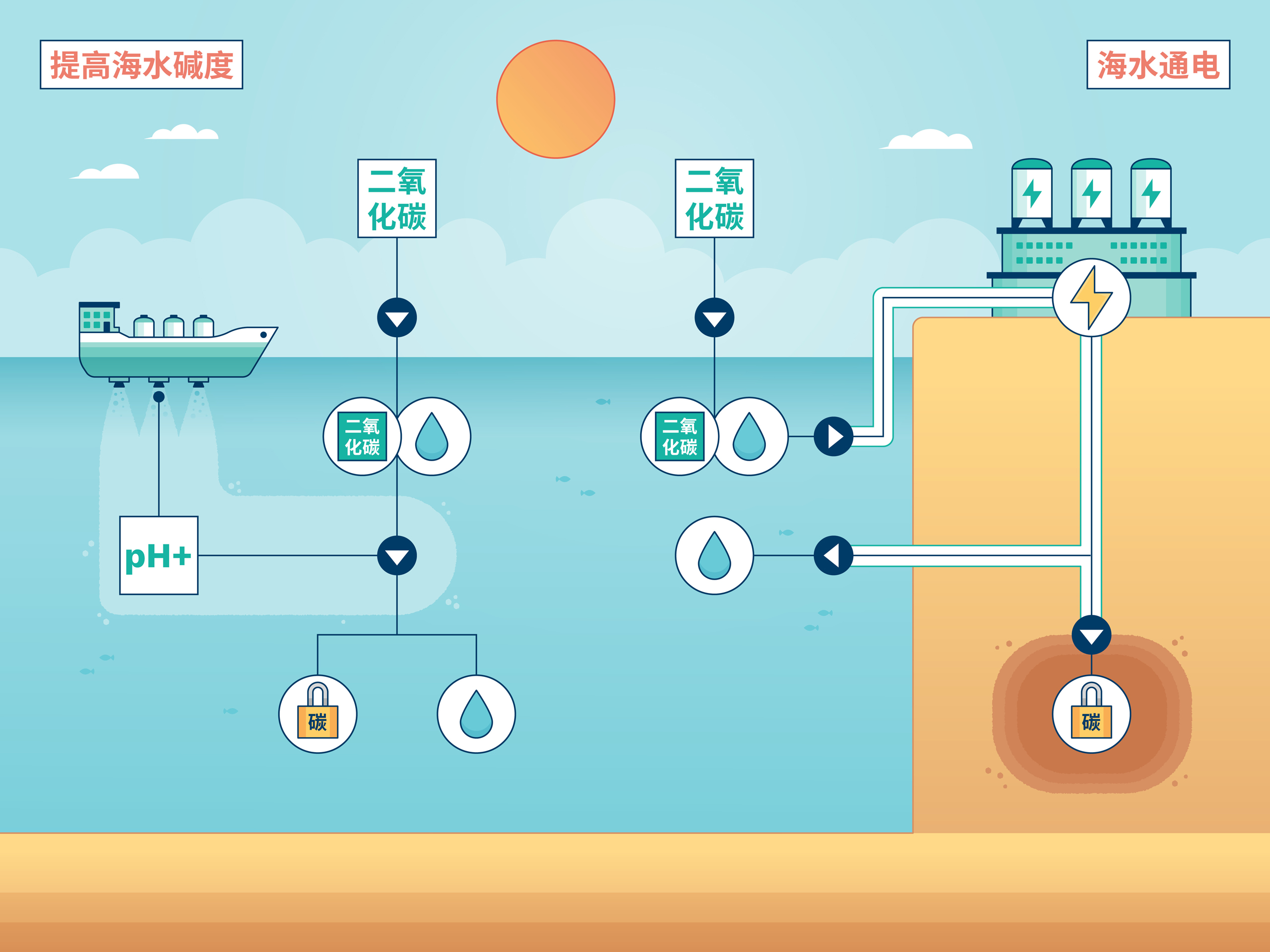 这两个方法都是通过处理,降低海水中二氧化碳的含量,使其可以从大气中吸收更多二氧化碳。所以,我们或许可以建立这样的一套系统:将海水泵入处理设施,通电,然后将其泵回海洋。这一方法能否做到低成本和可持续,取决于细节——尤其是要找到一种方式用可再生能源为其提供所需的电力。
