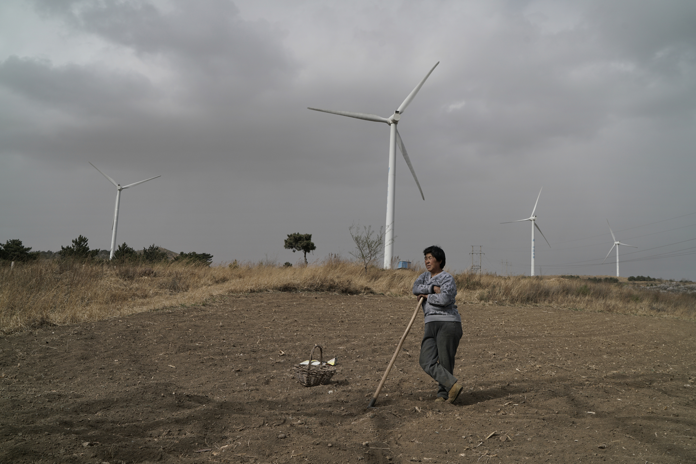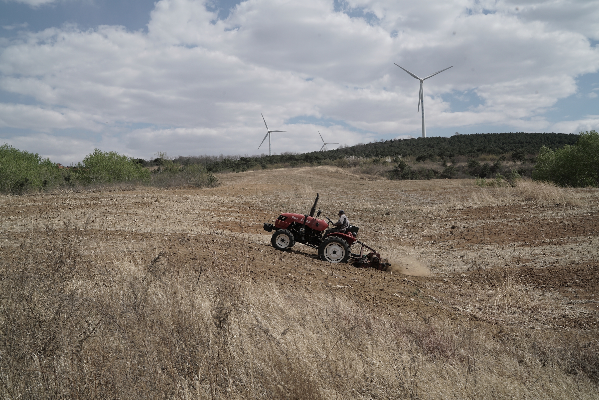 上午7点多,天阴沉沉的,风很大。远远地就能听到塔山顶上那几座新建的风电塔转得呼呼响。“这么大风……”估摸着今天也许会来场大雨,塔子沟村的陈芳扛上锄头,背上玉米种就上山了。直到下午5点了,她都已经把自家位于风电塔下的一亩多玉米地翻了一遍,大的碎石也清理干净了,云却散了,眼前的四座风电塔的大叶扇也停止了转动。