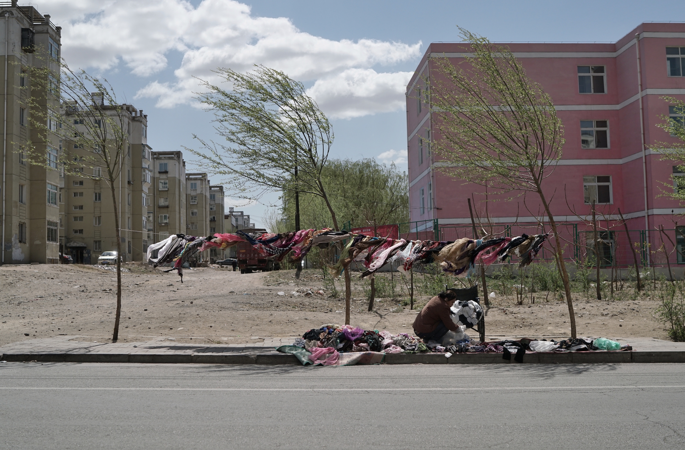 位于阜新新邱区的矿工新村里,卖丝巾的小贩高圆也在“等风”,她在两棵树之间拉了一条绳子,把丝巾在系在上面,风越大,丝巾就飘得越高,一元钱一条,风越大,丝巾就卖得越好;