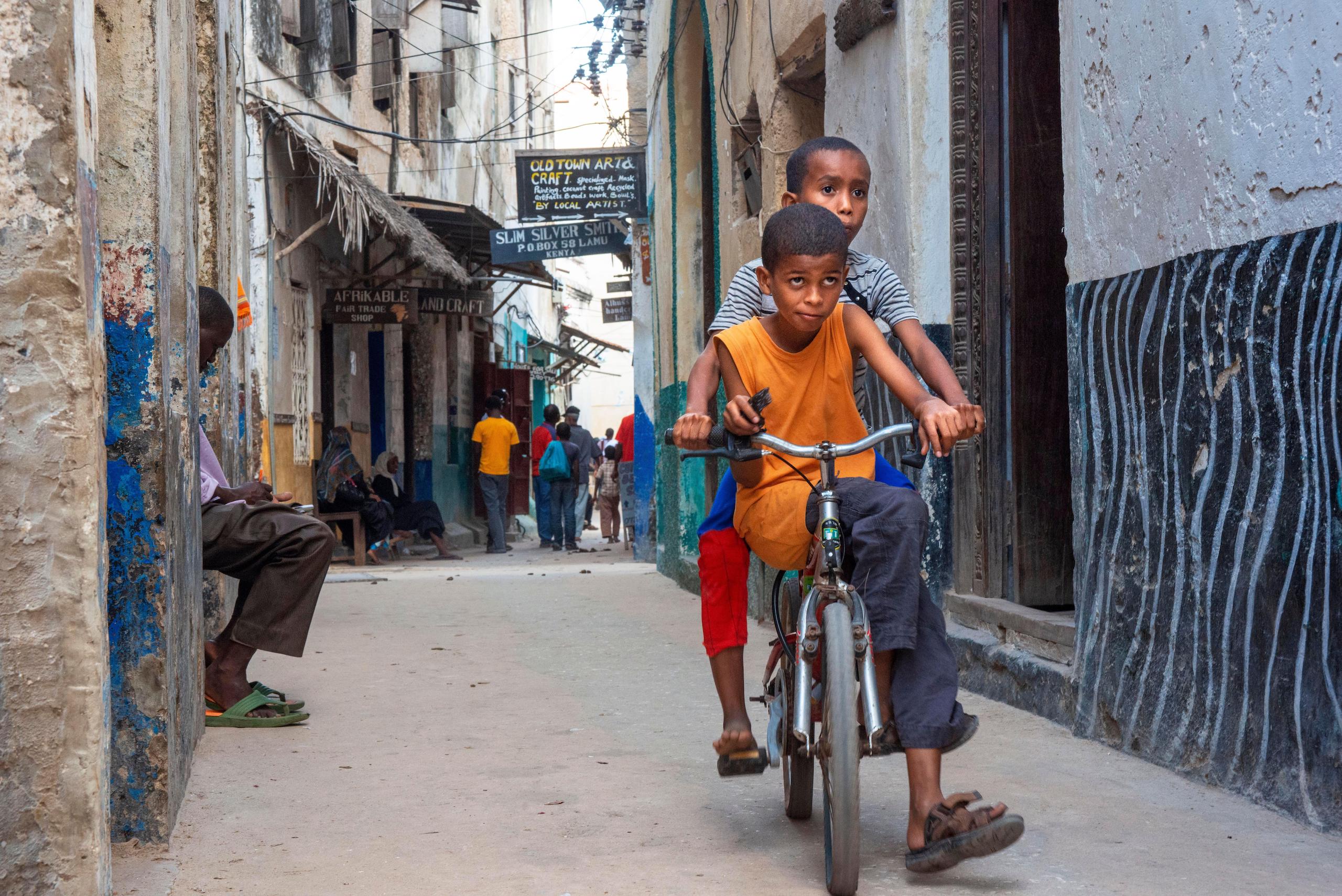 Boys riding on a bicycle in a narrow street of Lamu town in Lamu Island, Kenya.