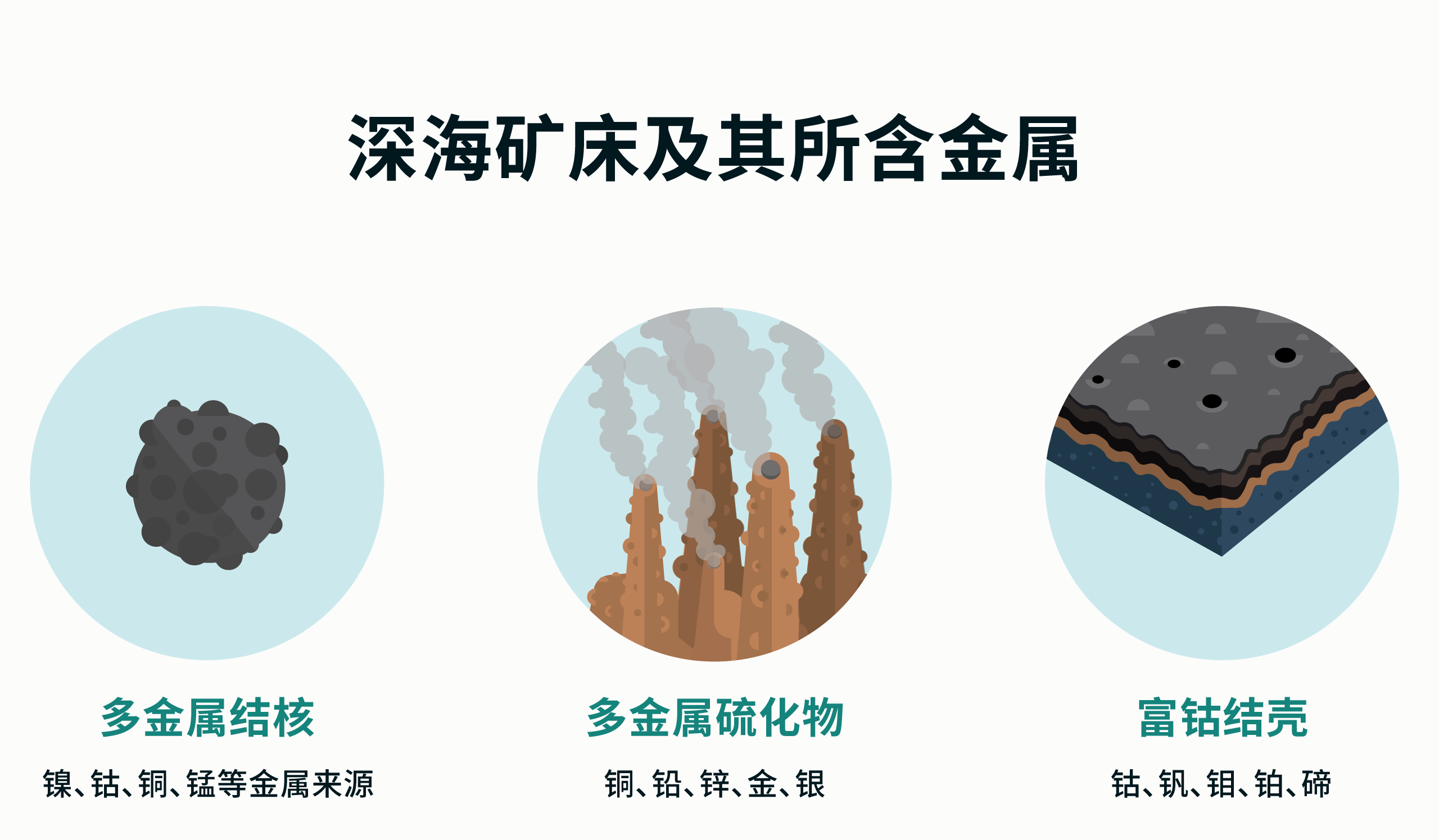 有意开展深海采矿项目的企业盯上的是镍、铜、钴、锰、锌、银和金等矿藏。这些就是所谓的“关键矿物”,即对现代技术至关重要,且广泛用于制造智能手机、笔记本电脑、太阳能电池板、风力涡轮机和电动汽车的金属。人们现在关注的主要有三类海洋矿藏:海底的多金属结核,多金属硫化物(即高温热液喷口附近形成的“深海块状硫化物”),以及覆盖在海底山脉(被称为海山)上的富钴铁锰结壳。