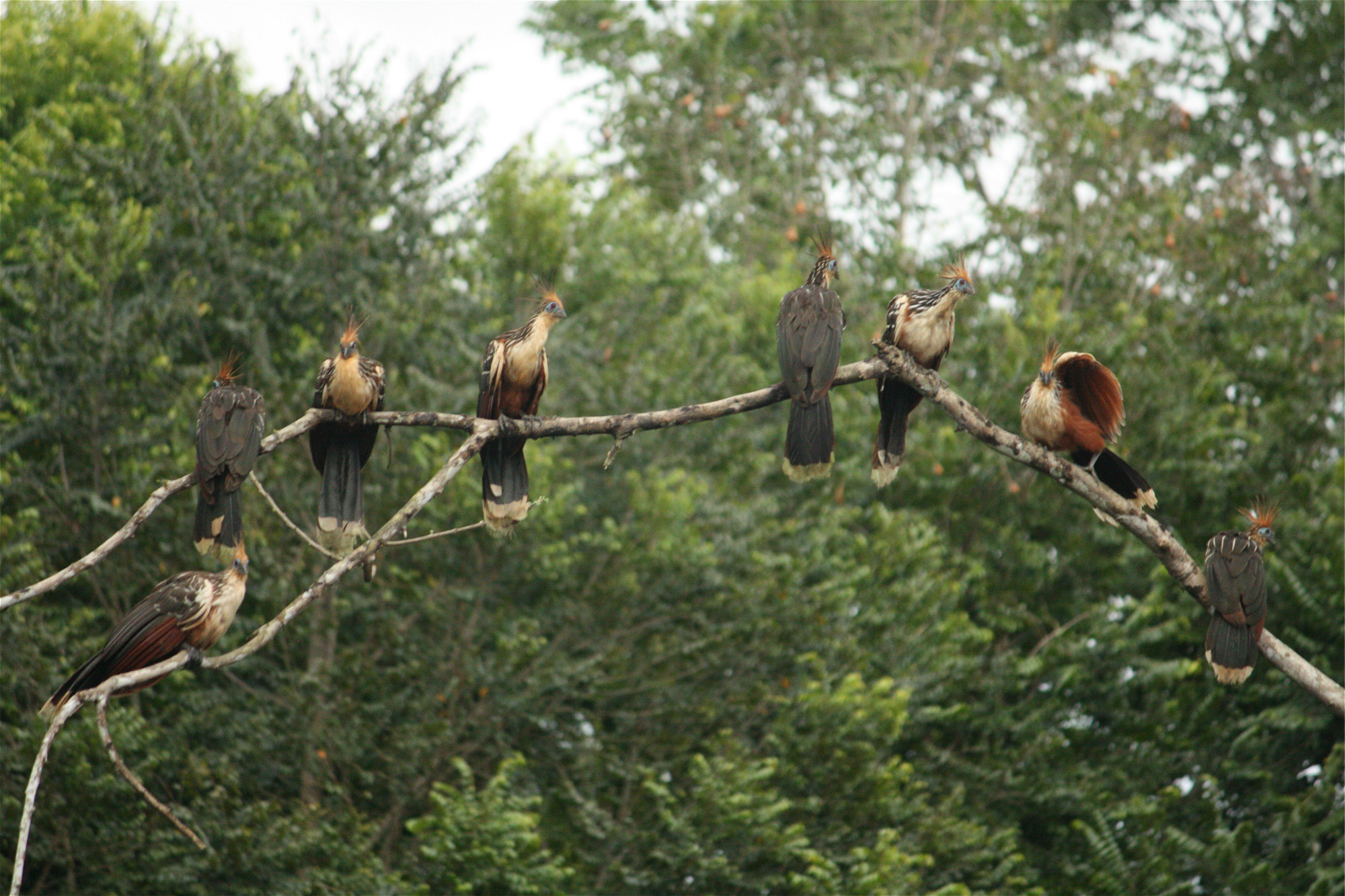 The cock was not the only sighting in Guaviare. In a lagoon, they saw a skunk bird, or hoatzin, feeding its two chicks by mouth. At the top of a nearby tree, they saw the silky plumage of the bare-necked fruitcrow. In a wetland area, they came across a group of horned screamers, with their raucous, far-carrying cry that resembles that of a donkey. One after the other, they saw the scarlet-crowned barbet, the slender-billed kite, the svelte sunbittern and the fast white-eared jacamar.